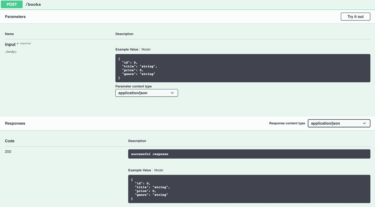 We can see from this screen what input the POST on "/books" is expecting, and OpenAPI even provides an example.